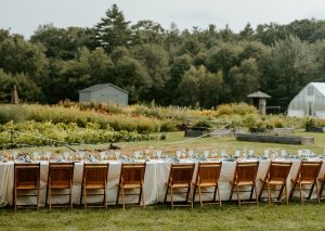 The afternoon unfolded with surprises at every turn. Guests began gathering around cozy fire pits on the lawn, shucking locally sourced Glidden Point oysters, and sipping cocktails. As rain clouds rolled in, they moved to the farm’s rustic barn just in time—settling in moments before the first drops began to fall. Inside, warm and dry beneath the barn’s rafters, guests dined by the cobalt glow of night and the soft percussion of rain on the roof.