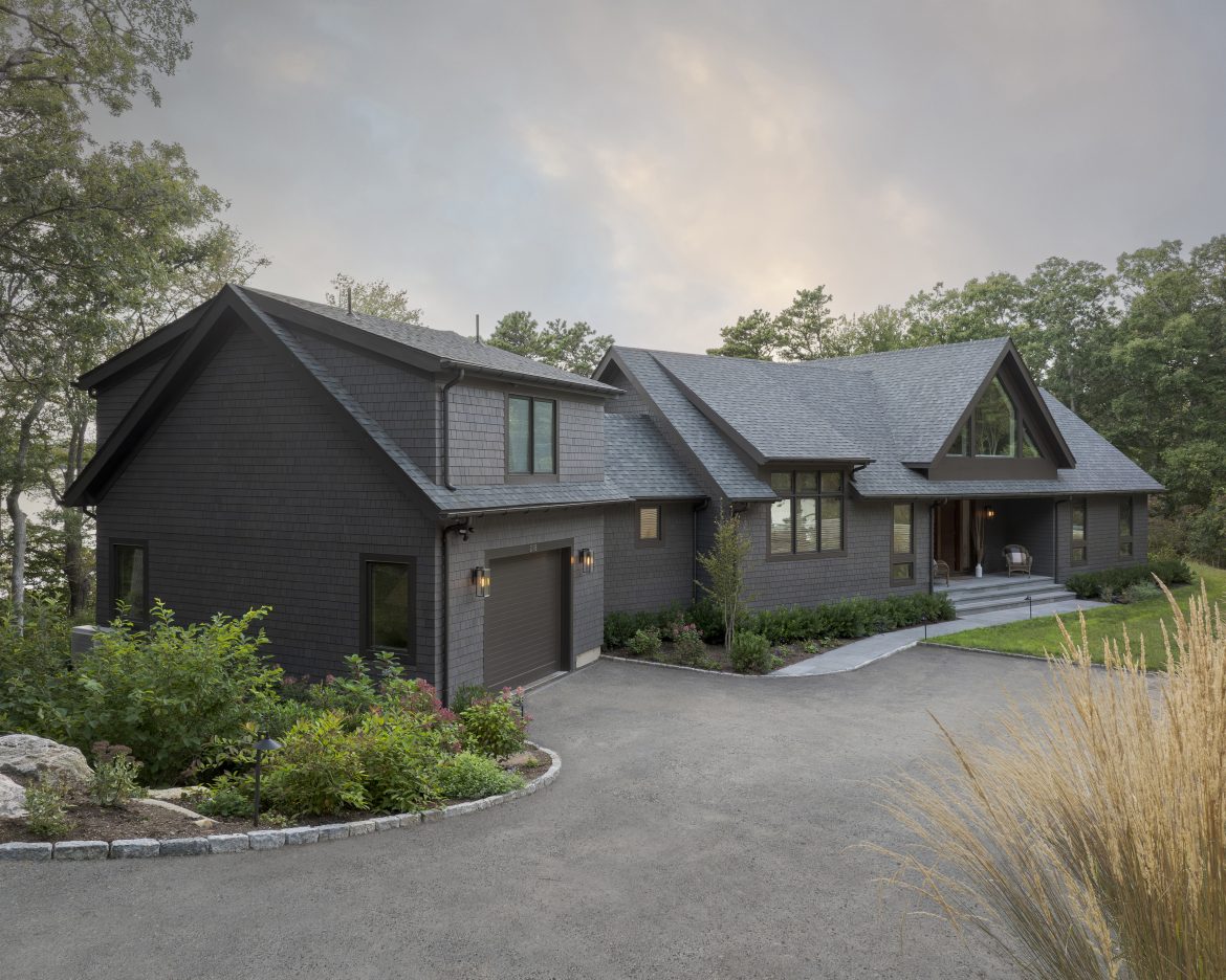 Dark, Jamaican pepper-stained Maibec cedar shingles help create cohesion with the natural environment (“The Maibec cedar shingles are durable and resistant to the coastal elements, aging gracefully near the water,” adds Manfredo), and the natural mahogany deck and cable railings nod to the coastal setting. Off the deck, Manfredo says, “It’s an expansive outdoor living area perfect for gatherings, leading right to the private beach for seamless access to the lake.”